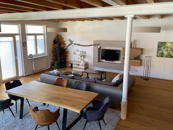 Der offene Wohn- & Essbereich mit hohem Gebälk ist das erste Highlights dieses besonderen Wohntraums.