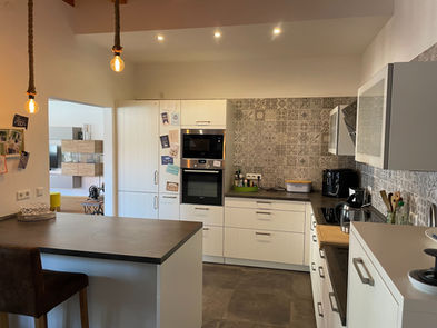Eine hochwertige Einbauküche inkl. Mikrowelle, Backofen, Kühlschrank und hoch gebauter Spülmaschine ist vorhanden und lädt zum gemeinsamen Kochen ein. Familie und Gäste nehmen gemütlich am hoch gebauten Küchenblock platz.